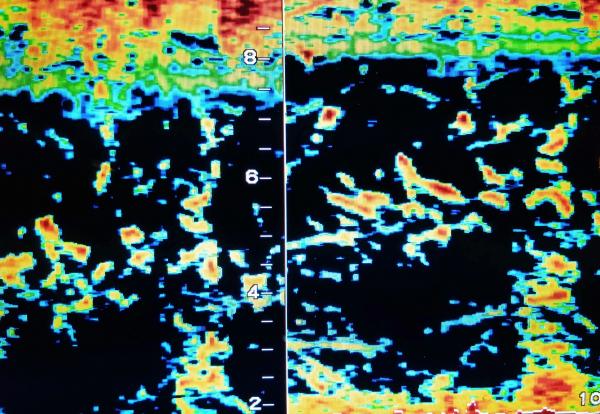 絶対に獲りたかったポイントでしたが、魚探の反応に乗せるとサーっと消えてしまう状態でアタリもなし。