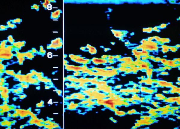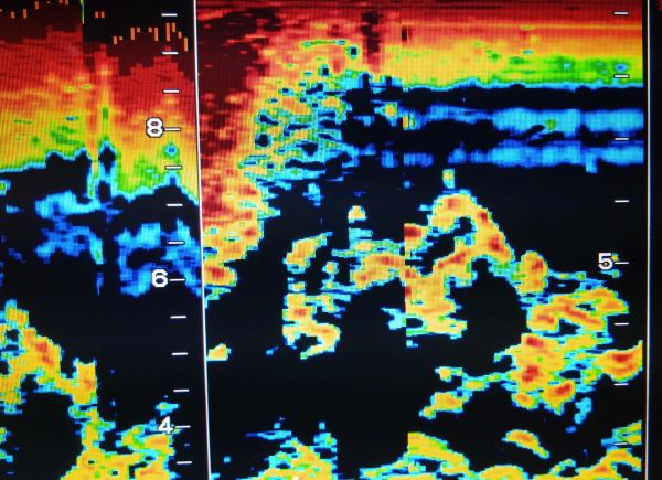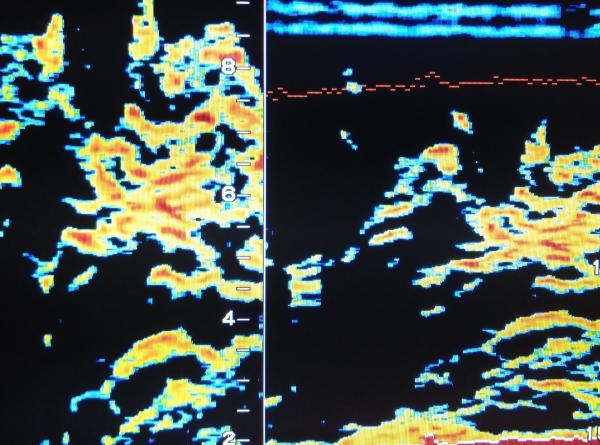 どこでもいい反応が出てアジはたくさんいるのがわかるし、アタリも良く出るんですが、何しろ二回りほど大きいサバが元気良くて邪魔ですね。 風も無風で潮も大人しく、条件は最高なんですけどね。 サバの群れを避けてアジの層まで落として喰わせる・・・・これができればなかなか楽しいと思いますよ